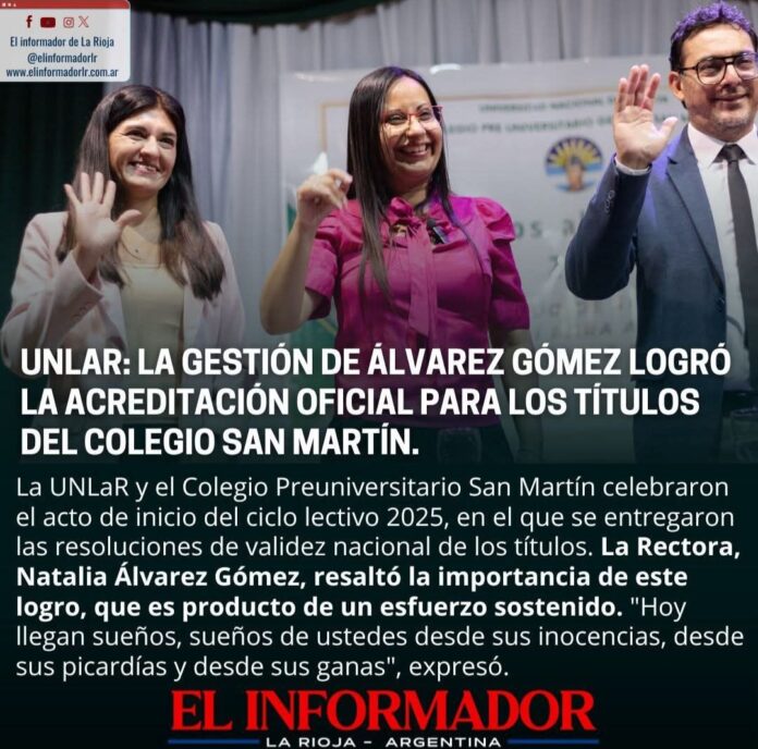 Inicio Local UNLaR: La gestión de Álvarez Gómez logró la acreditación oficial para los...LocalUNLaR: La gestión de Álvarez Gómez logró la acreditación oficial para los títulos del Colegio San Martín marzo 6, 2025FacebookTwitterPinterestVKWhatsApp Artículos relacionadosMás del autorEncontraron a un hombre de 86 años que llevaba meses muerto en su domicilio en Barrio FerroviarioLa Rioja homenajeó a los veteranos de Malvinas con el tradicional desfile del 2 de abrilEl COE inicia el operativo de Semana Santa en el Señor de la PeñaDEJA UNA RESPUESTA Cancelar respuestaPor favor ingrese su comentario! Por favor ingrese su nombre aquí ¡Has introducido una dirección de correo electrónico incorrecta!Por favor ingrese su dirección de correo electrónico aquí Guardar mi nombre, correo electrónico y sitio web en este navegador la próxima vez que comente.