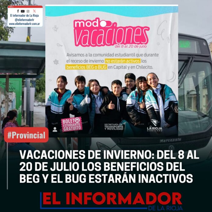 Inicio Transporte VACACIONES DE INVIERNO: DEL 8 AL 20 DE JULIO LOS BENEFICIARIOS DEL...TransporteVACACIONES DE INVIERNO: DEL 8 AL 20 DE JULIO LOS BENEFICIARIOS DEL BEG Y BUG ESTARÁN INACTIVOS julio 2, 2024FacebookTwitterPinterestVKWhatsApp Artículos relacionadosMás del autorAmplían la implementación del boleto estudiantil gratuito en escuelas de la CapitalRioja Bus informó demoras y sin servicio en líneas rurales por la lluviaRioja Bus dejará fijo el recorrido hacia el Parque de la Ciudad durante el 2026DEJA UNA RESPUESTA Cancelar respuestaPor favor ingrese su comentario! Por favor ingrese su nombre aquí ¡Has introducido una dirección de correo electrónico incorrecta!Por favor ingrese su dirección de correo electrónico aquí Guardar mi nombre, correo electrónico y sitio web en este navegador la próxima vez que comente.